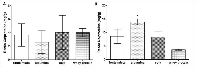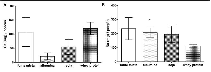 O artigo tem como objetivo comparar as concentrações de cálcio e sódio em suplementos proteicos de diferentes fontes. Foram comparadas as concentrações de proteína, cálcio e sódio e as razões cálcio/proteína e sódio/proteína de suplementos de fonte mista e de proteína de soja, que apresentaram quantidades maiores de proteína por porção quando comparados aos de albumina. Nas análises referentes ao sódio, os resultados foram maiores no grupo albumina em relação ao whey protein. As análises relativas ao cálcio não apresentaram resultados significativos. Maiores quantidades de sódio são encontradas em suplementos alimentares à base de albumina quando comparados a suplementos à base de whey protein. A alta variância das amostras evidencia que concentrações de sódio e cálcio não são regidas por qualquer critério na produção de suplementos proteicos.