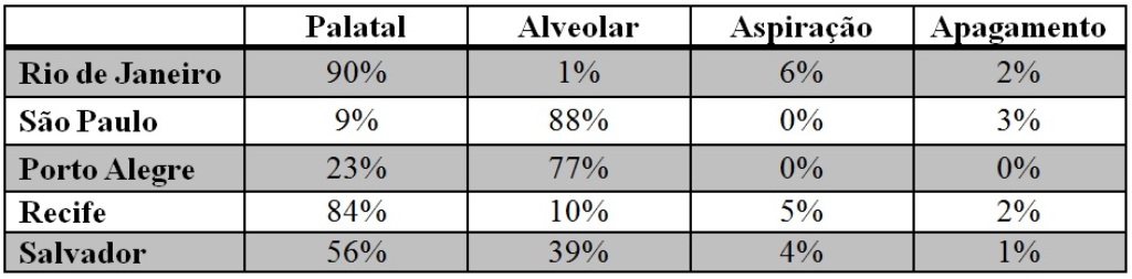 - Tabela 1 – Frequências de produção de cada uma das variantes do /S/ pós-vocálico, em posição medial, em 5 capitais brasileiras (Português (Brasil))