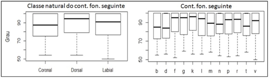 - Figura 2 - Distribuição e dispersão das respostas com relação às variáveis “classe natural” e “Cont. fon. seguinte” (Português (Brasil))