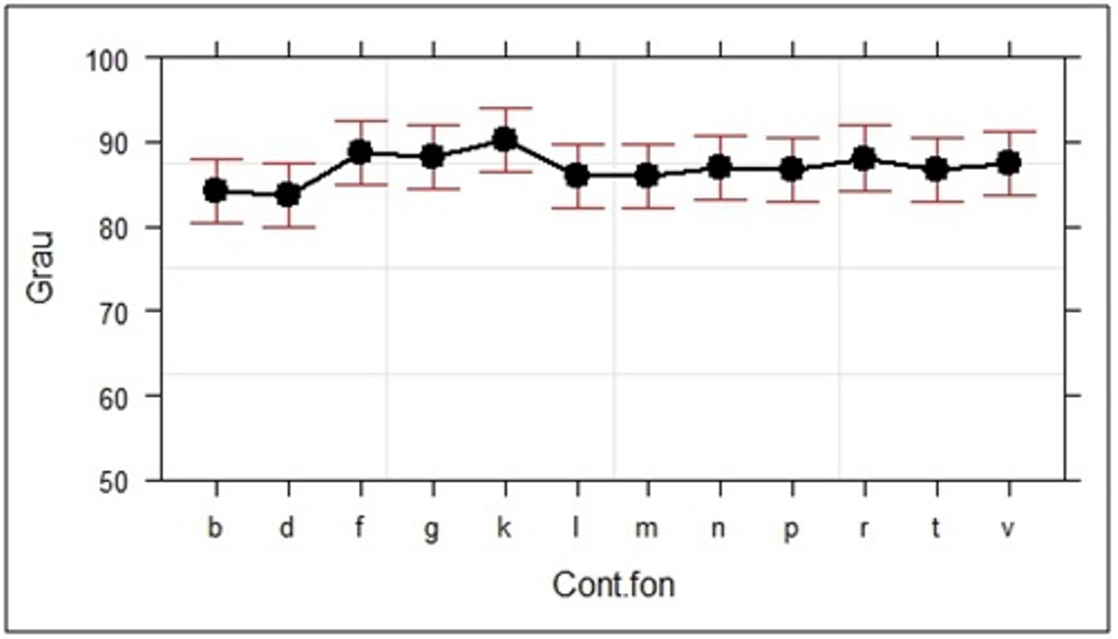 - Gráfico 3 – Gráfico de efeitos de médias previstas para o Grau de diferença atribuído com relação aos níveis da variável “Contexto fonético seguinte” (Português (Brasil))